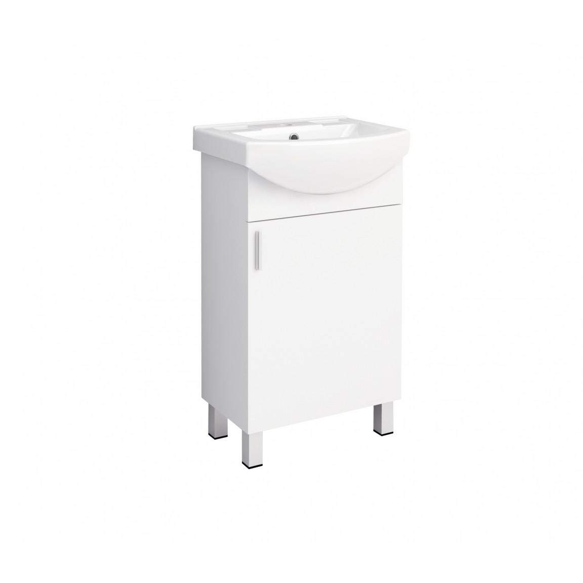 Kompakt, mégis stílusos fürdőszobai szekrény egyajtós kivitelben, kerámia mosdóval, fényes fehér felülettel és alumínium fogantyúval – ideális kis méretű fürdőszobákba is.