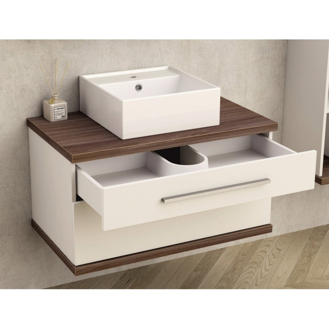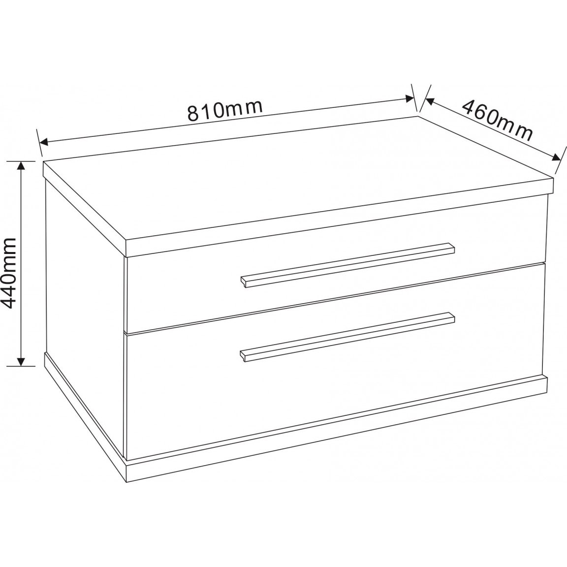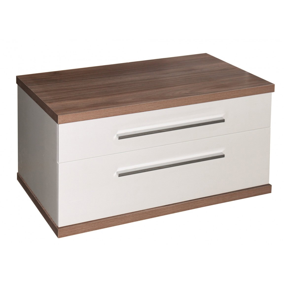 A szekrény 2 tágas fiókkal rendelkezik, amelyek puha záródású DTC síneken futnak – ez csendes, kényelmes használatot és hosszú élettartamot biztosít. A krómozott fogantyúk modern eleganciát kölcsönöznek a természetes hatású PS011 színű fa mintázatú PVC felületnek.