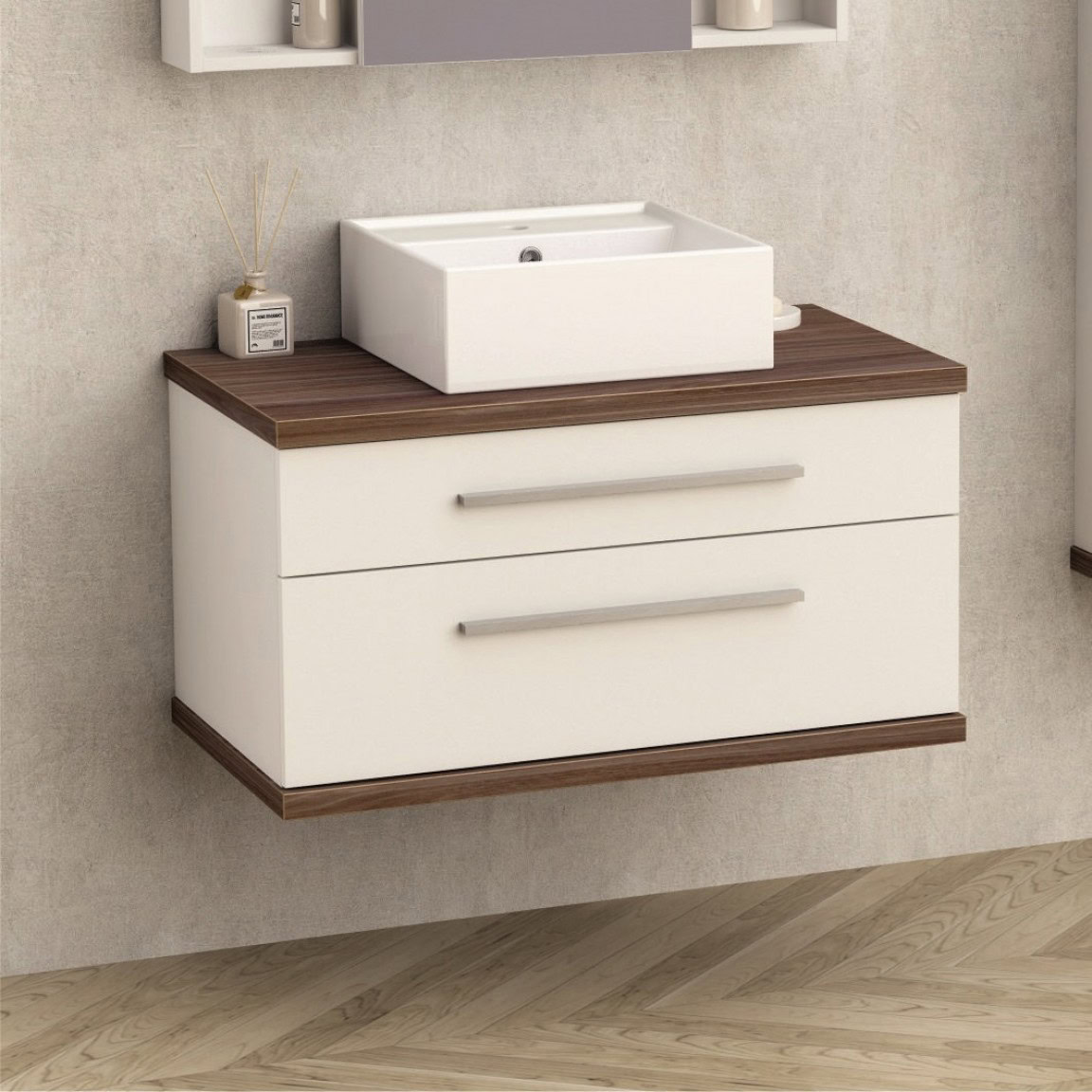Stílusos, 81 cm széles fürdőszobai szekrény két halk záródású fiókkal, krómozott fogantyúkkal és vízálló PS011 fa hatású PVC felülettel. Az ICP 8144-2 falra szerelhető és összeszerelve érkezik.