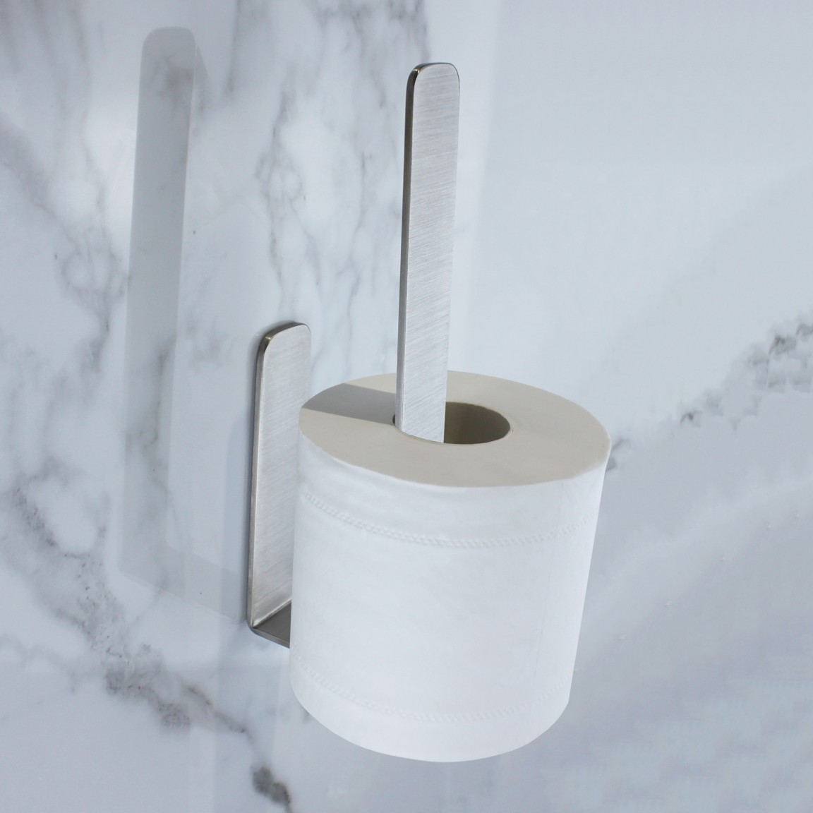 Modern kialakítású, öntapadós tartalék WC-papír tartó rozsdamentes acélból, matt ezüst színben. Ideális megoldás minden fürdőszobába – egyszerű felszerelés, tartós minőség.