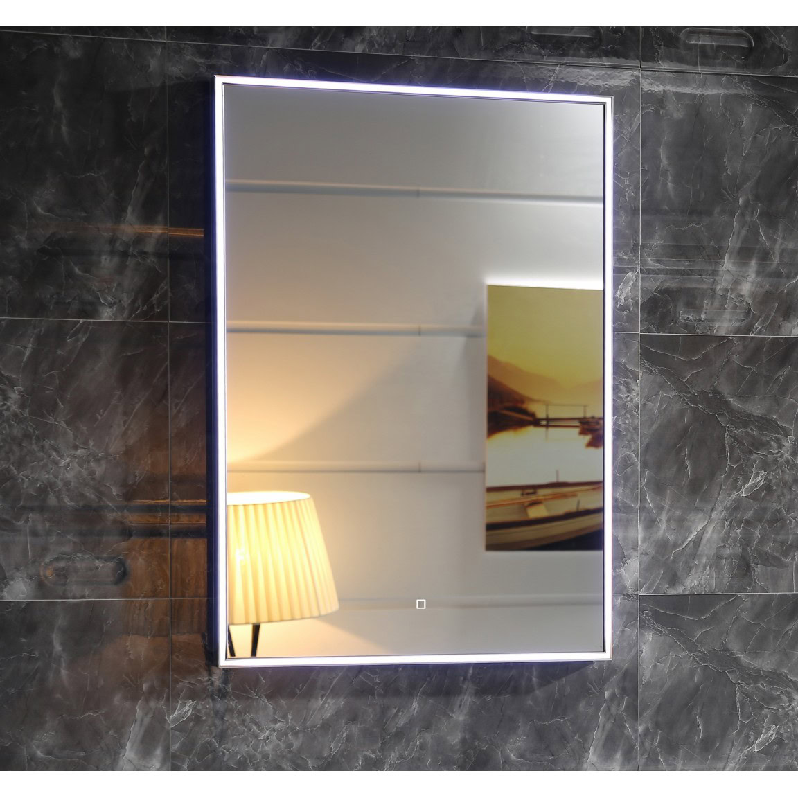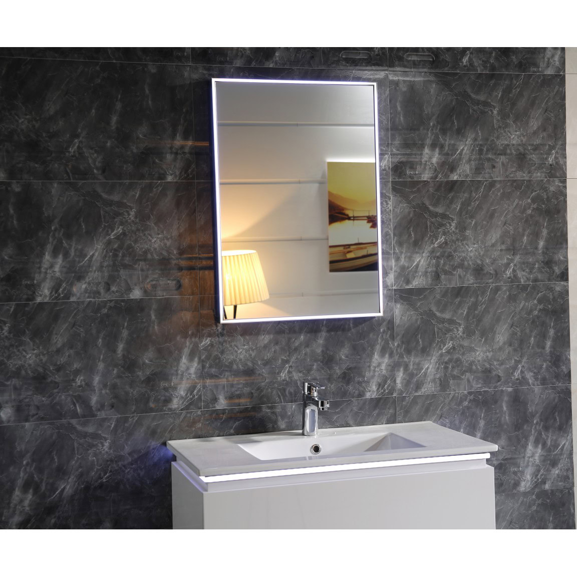 Modern, beépített LED világítással rendelkező fürdőszobai tükör 60×80 cm méretben, érintőkapcsolóval, páramentesítővel, valamint óra és hőmérséklet funkcióval.