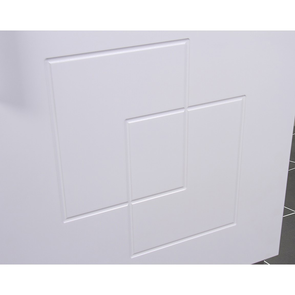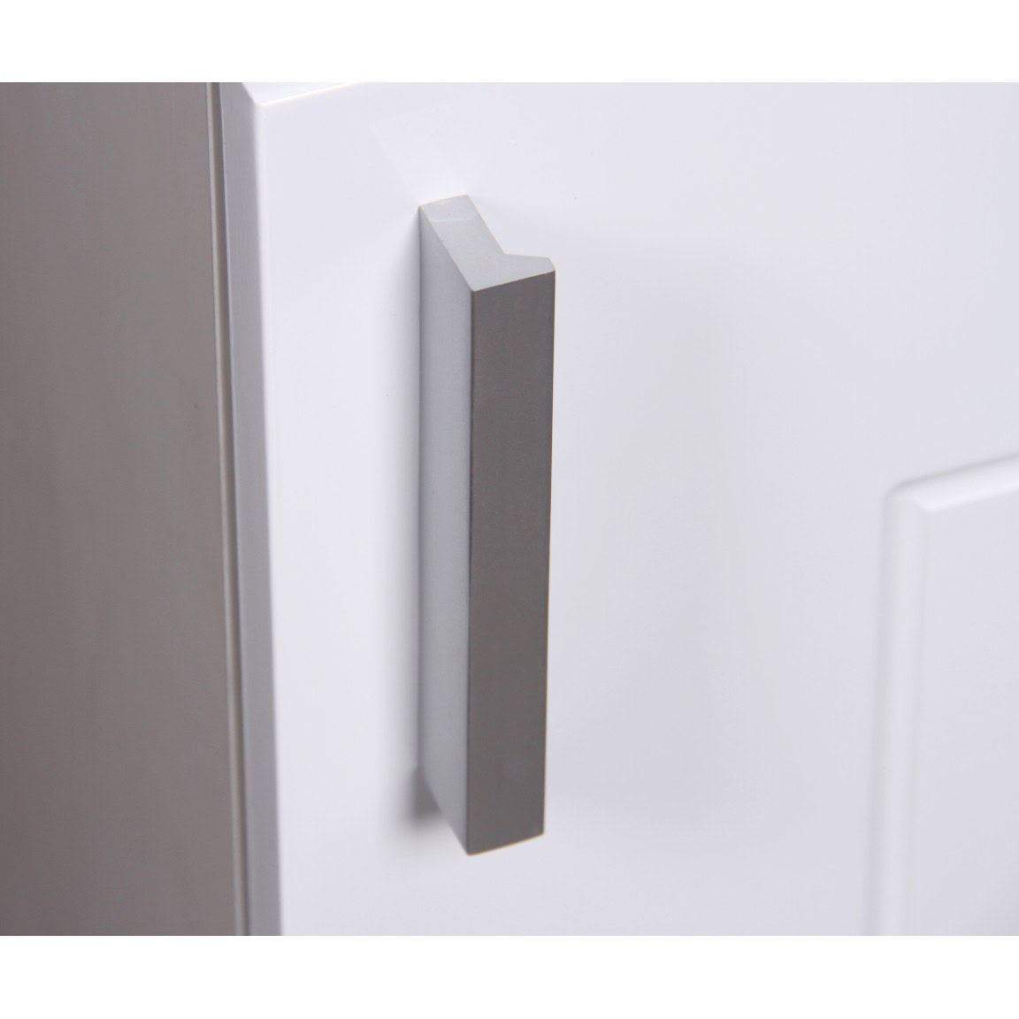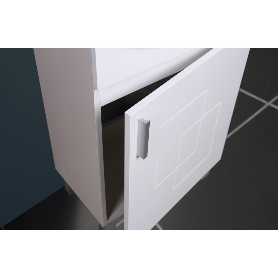 A szekrény egy darab ajtóval rendelkezik, melyet DTC soft-close zsanérral szereltek fel a halk és kényelmes használat érdekében. Az ajtó dekoratív mintázattal készül, a nyitásiránya szabadon megfordítható, így rugalmasan illeszkedik a térhez. A matt színű alumínium fogantyú és matt műanyag lábak modern és letisztult összhatást biztosítanak.