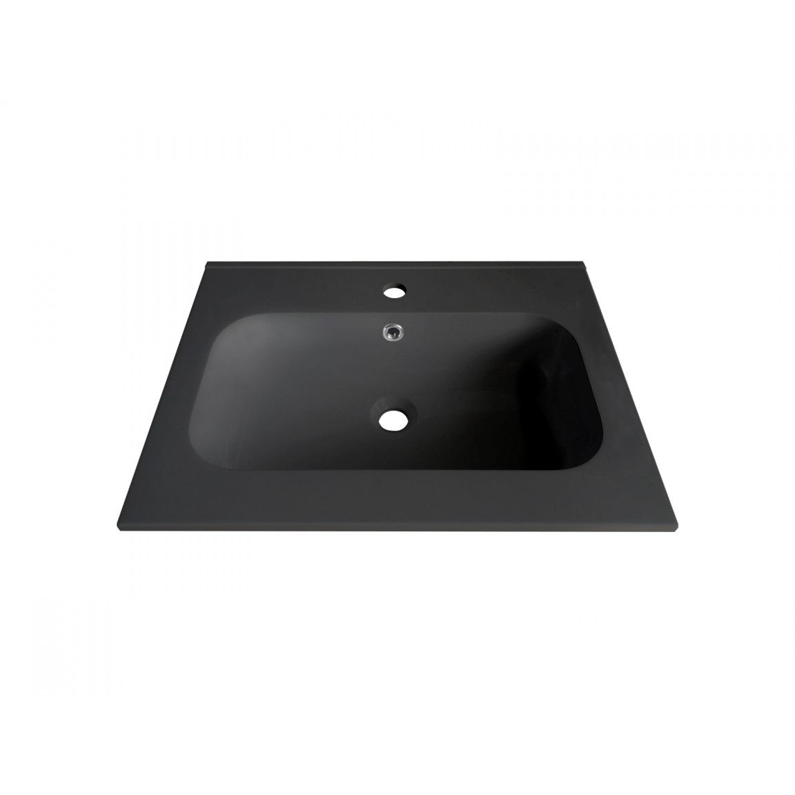 Modern, szekrényre szerelhető matt fekete mosdó prémium gyantaanyagból, túlfolyóval és csaplyukkal ellátva. Stílusos megjelenés és kiváló ellenállás a mindennapi használattal szemben.