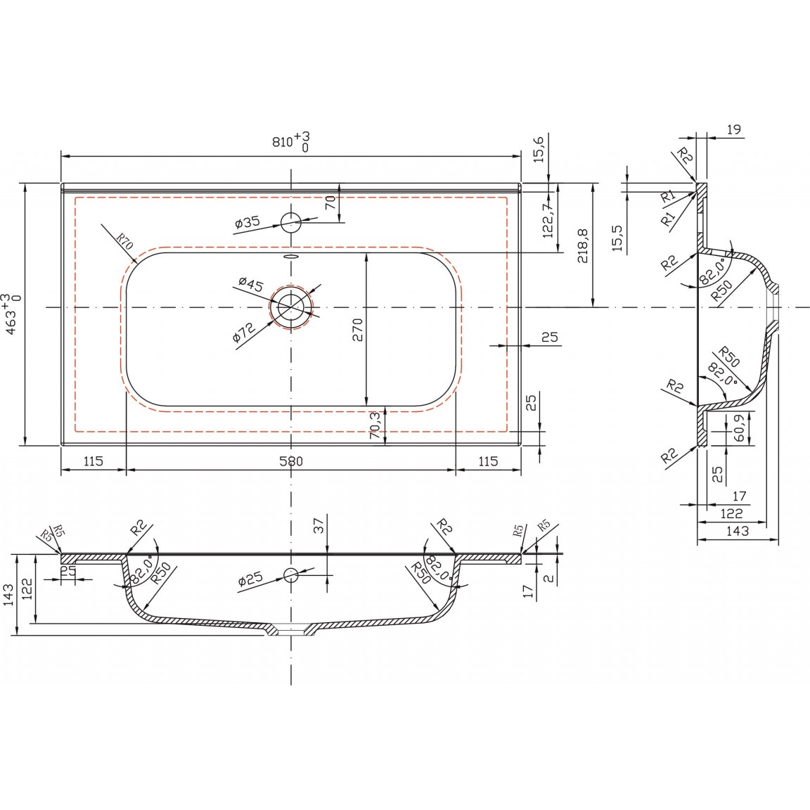 A mosdó tartós gyanta anyagból készül, amely vízálló, ellenáll a karcolásoknak, és hosszú élettartamot garantál. A beépített csaplyuk lehetővé teszi bármilyen szabványos csaptelep használatát, a túlfolyónyílás pedig biztosítja a biztonságos vízhasználatot. A mosdó lefolyót nem tartalmaz, így az egyénileg választható, a fürdőszoba stílusához igazodva.