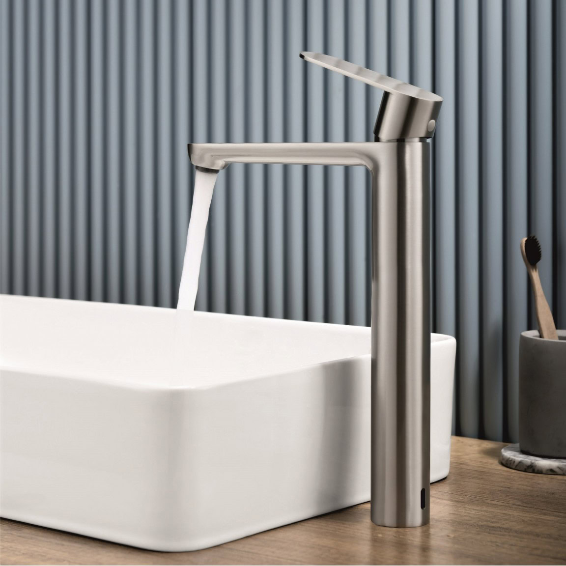 Modern, elegáns megjelenésű magas mosdócsaptelep szálcsiszolt (brushed) kivitelben, prémium SS304 rozsdamentes acélból.