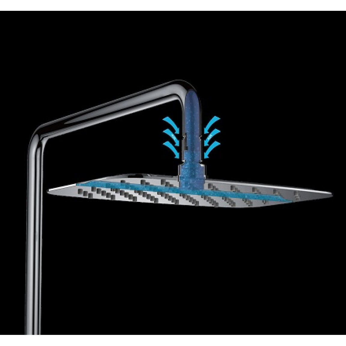 A nagyméretű, 30×36 cm-es esőztető fejzuhany vízesés funkcióval frissítő és exkluzív zuhanyélményt kínál. A háromfunkciós kézizuhany (permet, masszázs, kombinált) sokoldalú felhasználást tesz lehetővé. A szilikon borítású, szatén felületű gégecső, valamint a mozgatható zuhanyfej-tartó maximális kényelmet biztosít.