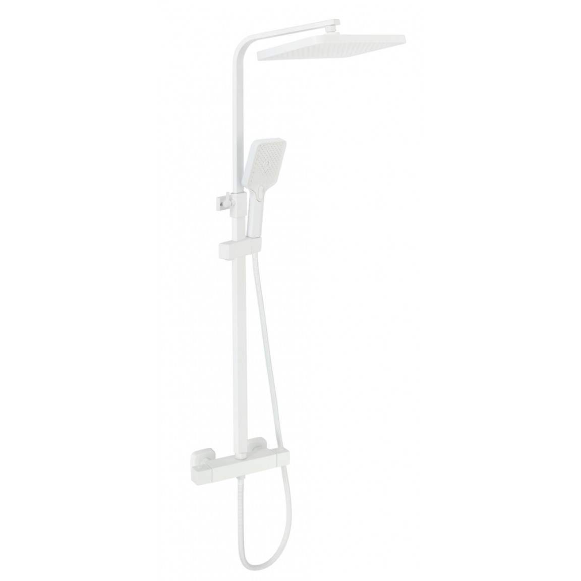 Modern és exkluzív zuhanyrendszer matt fehér színben, nagyméretű esőztető fejjel, kétfunkciós kézizuhannyal és Vernet termosztátos csapteleppel – 71–109 cm között állítható magassággal.