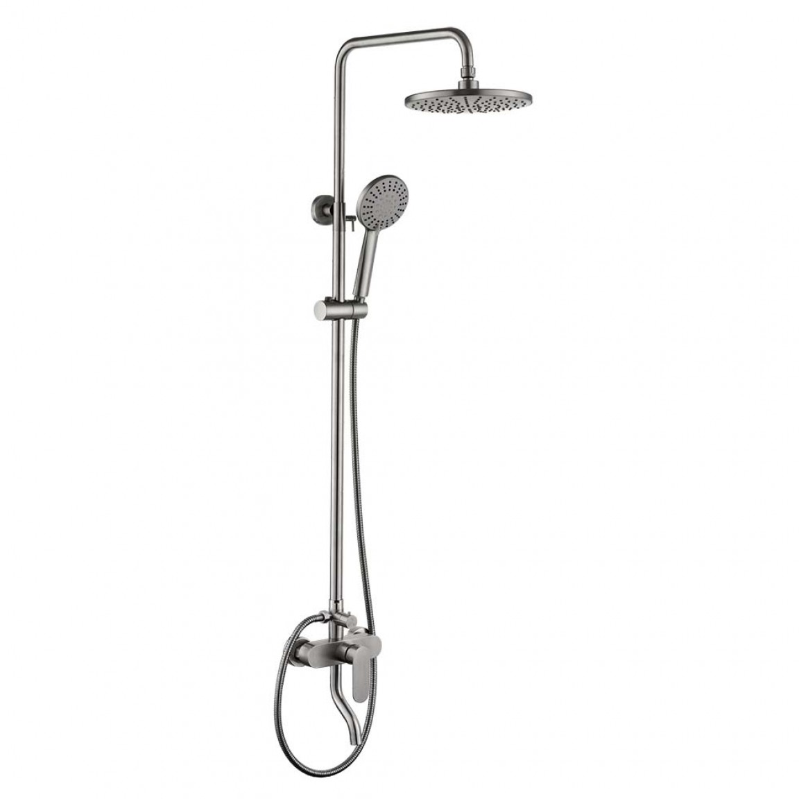 Modern kialakítású, szálcsiszolt acél felületű zuhanyszett felső zuhannyal, kézizuhannyal és fürdőkádtöltő csapteleppel. Ideális választás stílusos és praktikus fürdőszobákba.