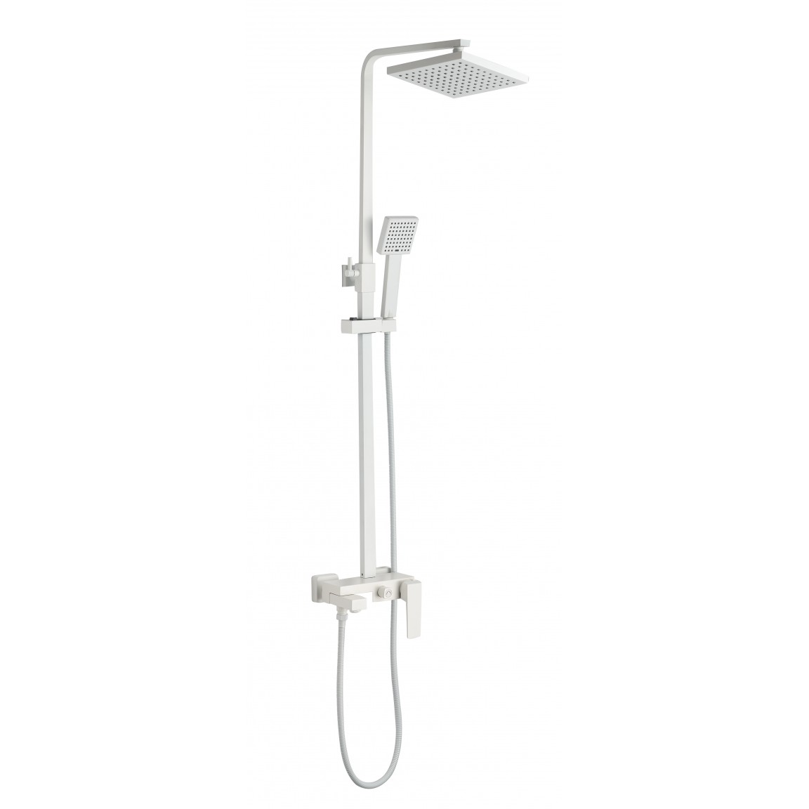 Modern, letisztult stílusú zuhanyszett matt fehér kivitelben, sárgaréz csapteleppel, állítható magassággal és praktikus esőztető fejjel.