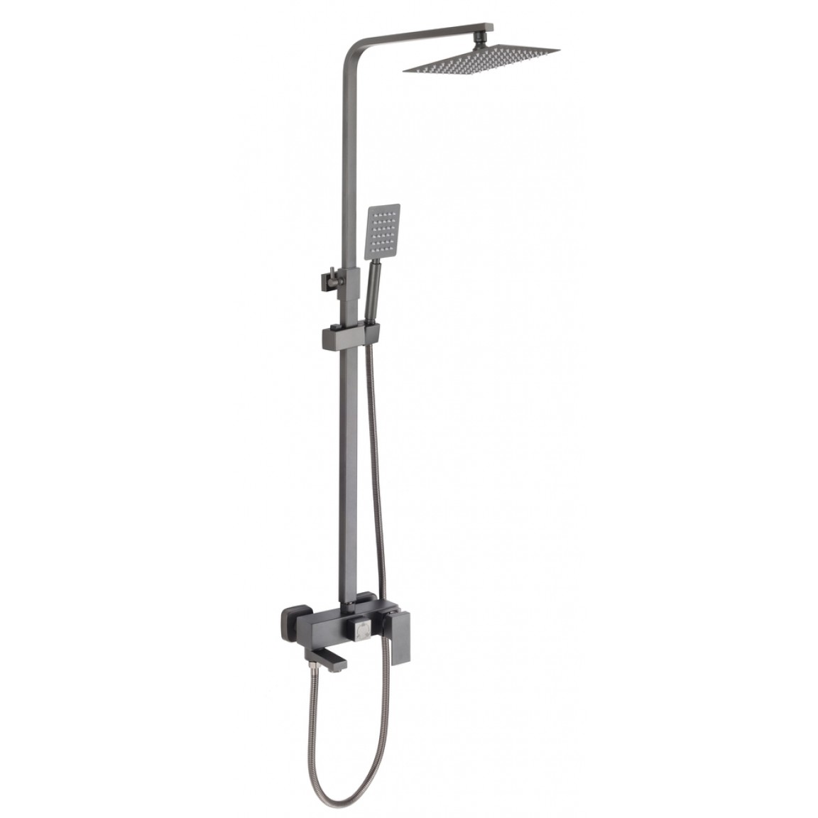 Prémium minőségű, szögletes dizájnú, gun grey színű zuhanyrendszer, amely SS304 rozsdamentes acél fej- és kézizuhannyal, valamint Sedal kerámiabetétes csapteleppel van felszerelve.