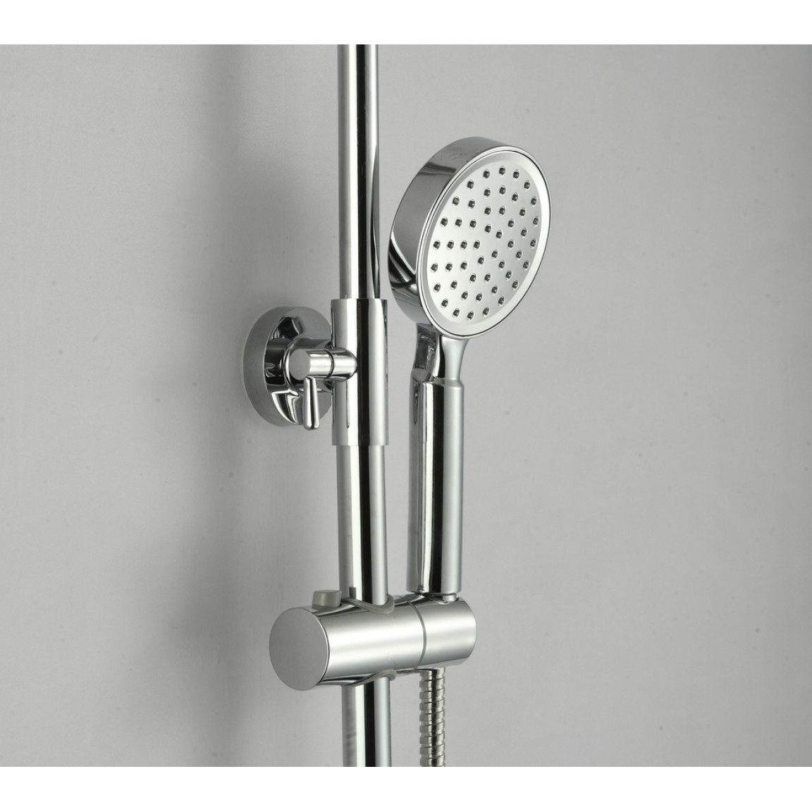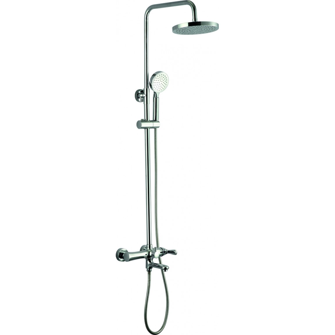 Prémium, állítható magasságú zuhanyrendszer rozsdamentes acél csővel, egyfunkciós esőztető fejjel, kézizuhannyal, mozgatható kifolyós sárgaréz csapteleppel és váltókapcsolóval. Ideális választás modern fürdőszobákba.