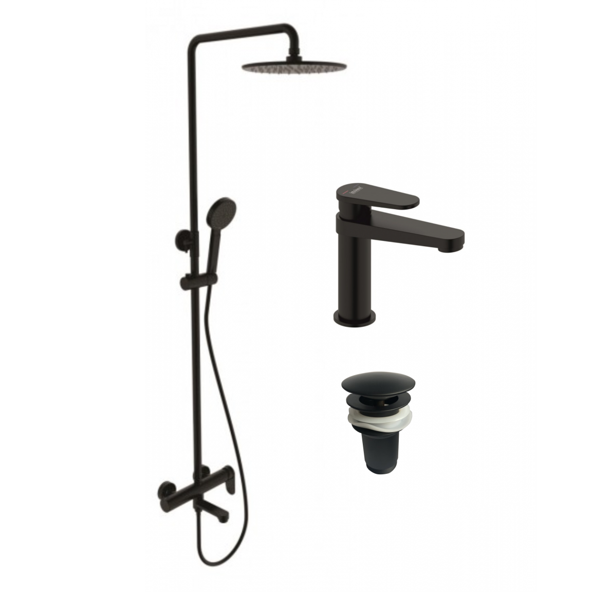Modern, fekete matt kivitelű zuhanyszett állítható magasságú rozsdamentes acél zuhanyrendszerrel, mosdócsapteleppel és klikk szifonnal.