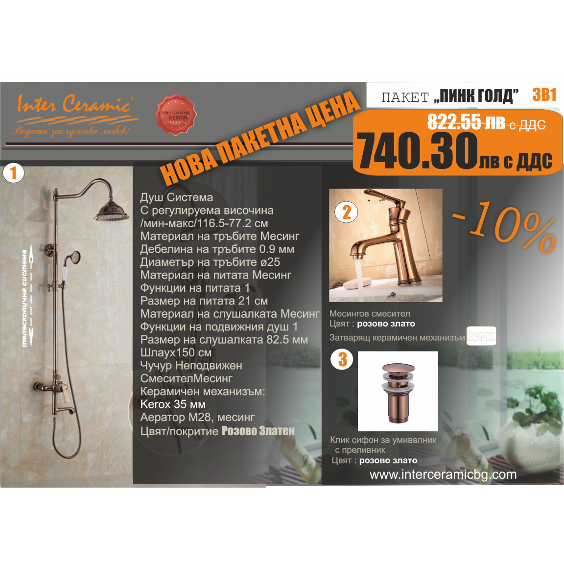 Az ICT Pink Gold zuhanyszett egy luxus kivitelű, háromrészes fürdőszobai megoldás, amely egy modern zuhanyrendszert, egy sárgarézből készült mosdócsaptelepet és egy arany-rózsaszín színű klikk szifont tartalmaz túlfolyós mosdóhoz.