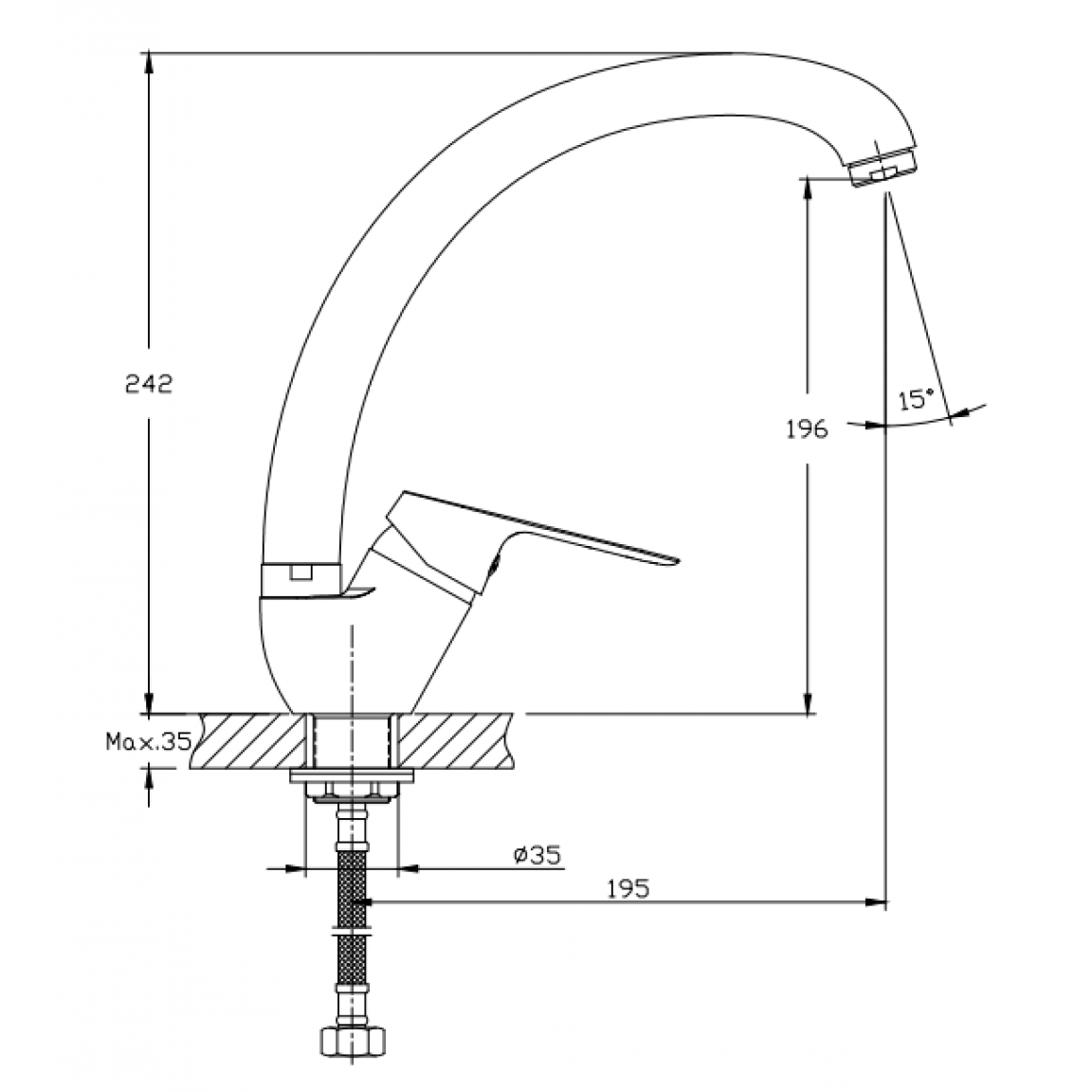 Modern formavilágú, egykaros konyhai csaptelep krómozott kivitelben. Sedal 35 mm-es kerámiabetéttel és felső kifolyóval. Tartalmazza a flexibilis bekötőcsöveket és a rögzítőkészletet.