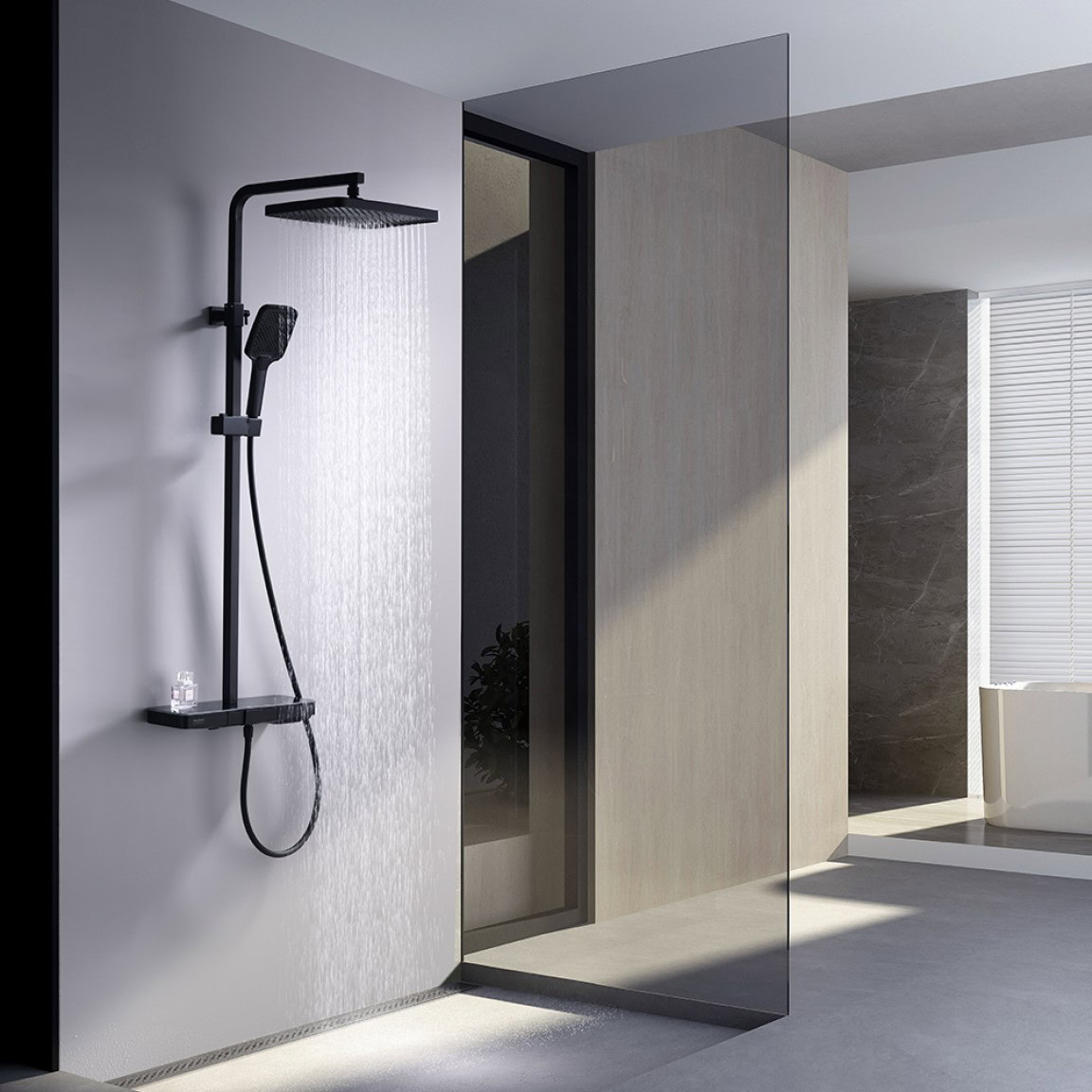 Stílusos és funkcionális esőztető zuhanyszett extra nagy állítható magassággal (96–157 cm), 34 × 22 cm-es felső zuhannyal, 3-funkciós kézizuhannyal, dupla termosztátos vezérléssel és beépített üvegpolccal – elegáns matt fekete színben.