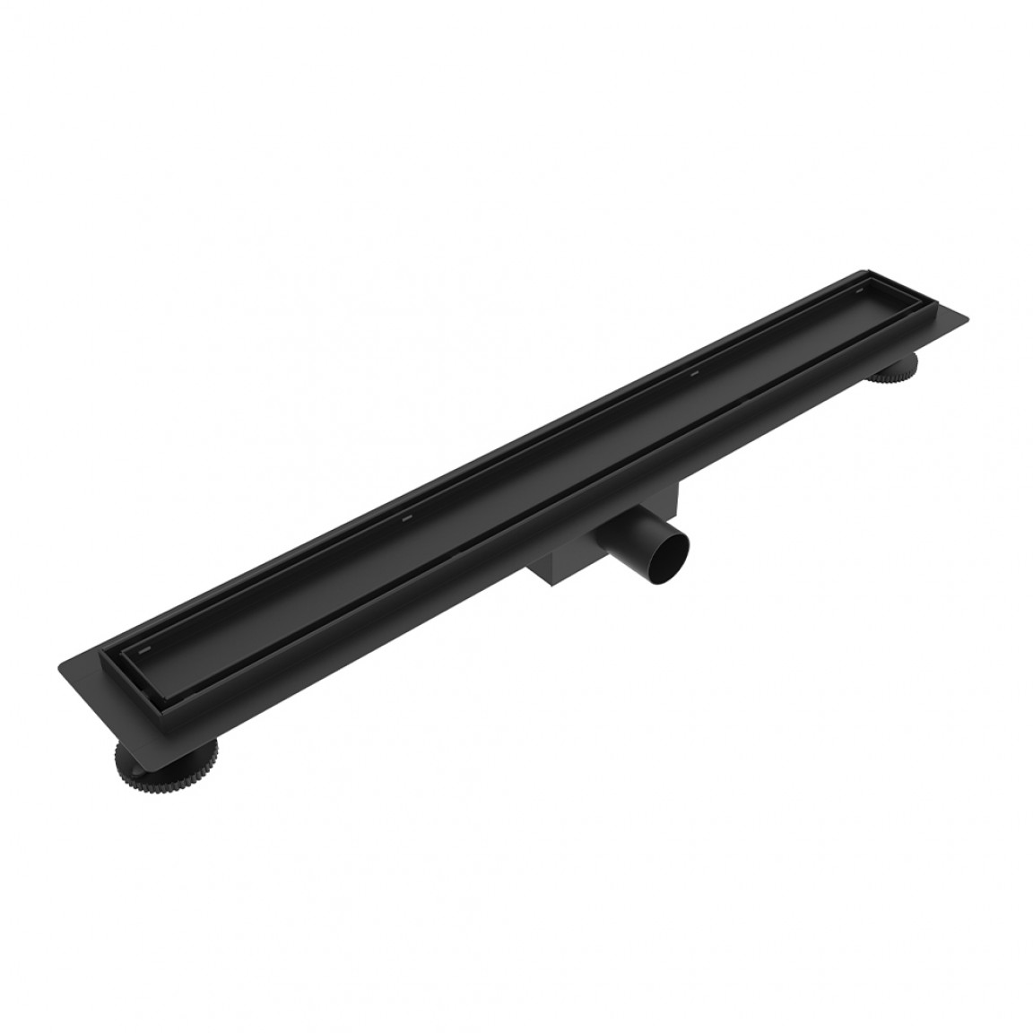 Modern stílusú, matt fekete rozsdamentes acél padlóösszefolyó 60 cm-es hosszúságban, száraz és nedves szifonmechanizmussal, kiváló vízelvezető teljesítménnyel.