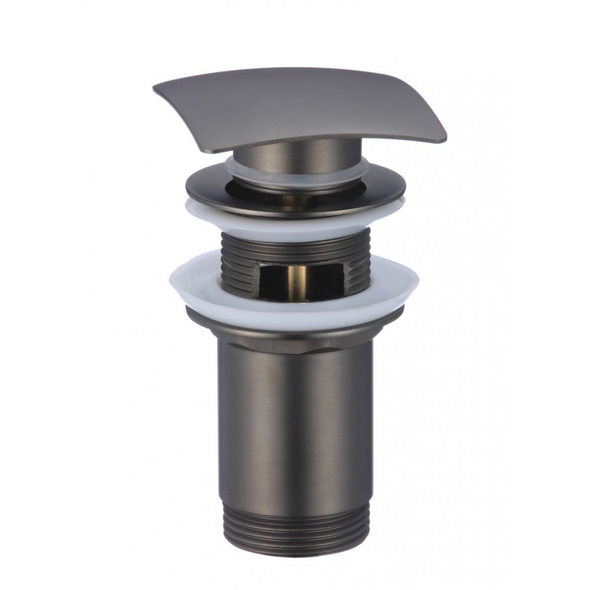 Modern megjelenésű, gun grey színű, rézből készült pop-up leeresztőszelep túlfolyós mosdókhoz, négyzet alakú fedéllel.