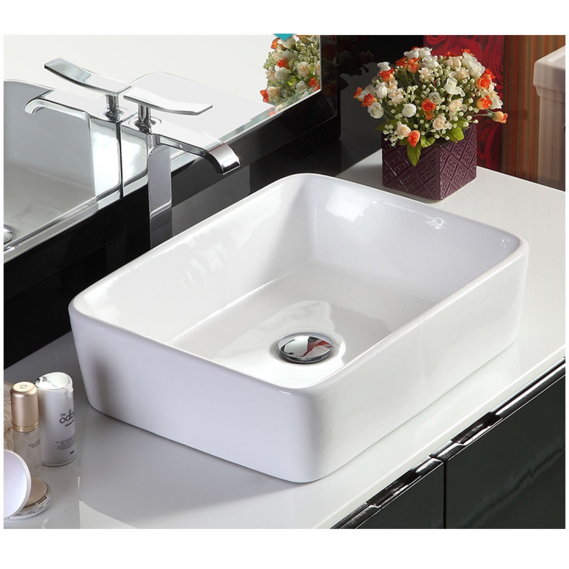 Elegáns és kompakt kialakítású fehér porcelán mosdó, mely pultra helyezhető formájával ideális kisebb és modern fürdőszobákba is. Letisztult vonalvezetés, fényes máz, időtálló minőség.