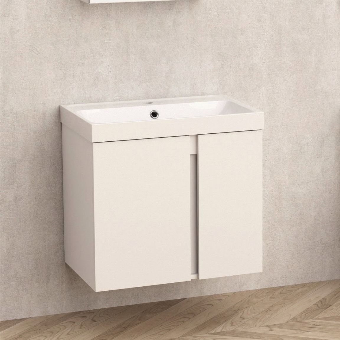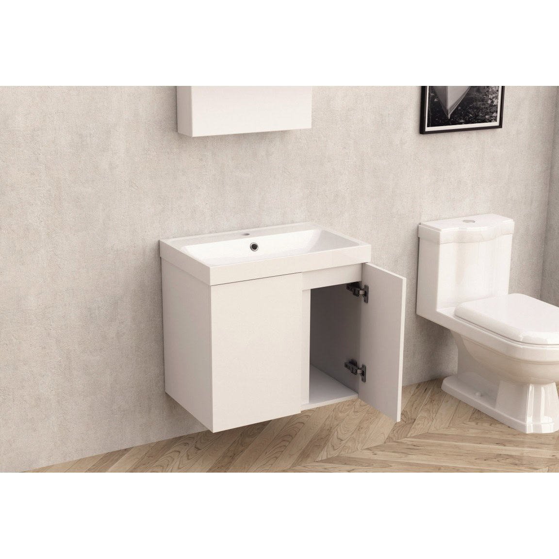 Az ICP 6087 “ZORA” modern stílusú, falra szerelhető fürdőszobai szekrény ideális választás a letisztult és funkcionális fürdőszobai környezethez. A kiváló minőségű PVC alapanyag és az ellenálló polimermárvány (rezin) mosdó tartósságot és stílust biztosítanak.