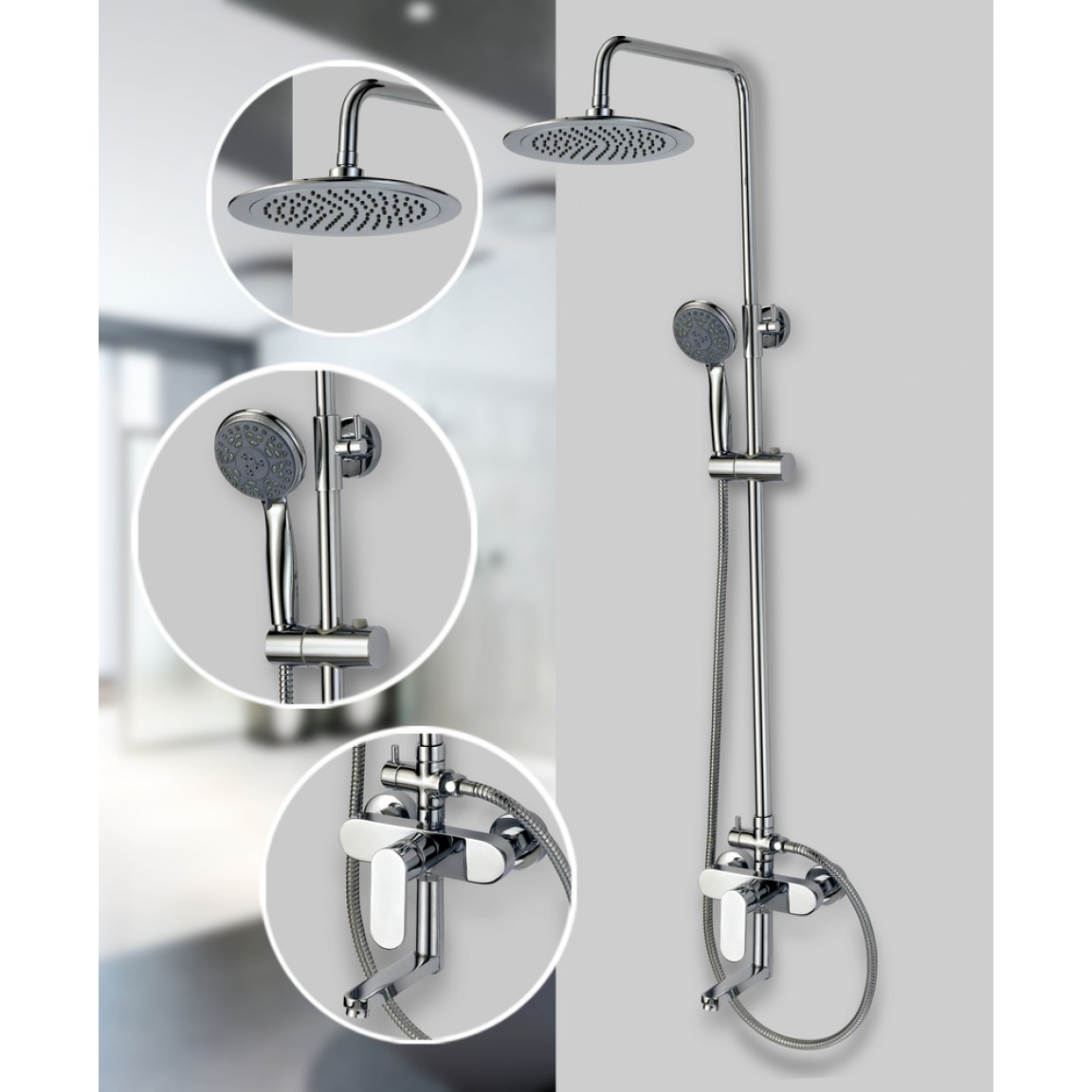 A zuhanyszett tartalmaz egy egyfunkciós felső esőztető zuhanyfejet (ABS műanyagból), mozgatható kézizuhanyt, sárgaréz keverőcsaptelepet, váltókapcsolót, valamint egy mozgatható kifolyót, így teljes körű megoldást nyújt fürdőszobai zuhanyzáshoz.