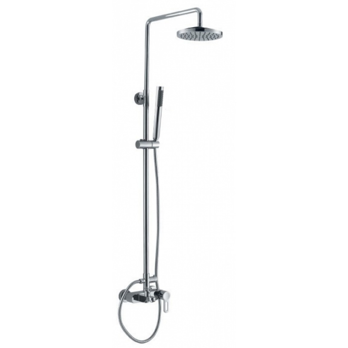 Állítható magasságú teleszkópos zuhanyrendszer elegáns kialakítással. Tartalmaz felső esőztetőt, kézizuhanyt, keverőcsaptelepet, kifolyót és váltókapcsolót. Megbízható minőség, 5 év csaptelep-garanciával.