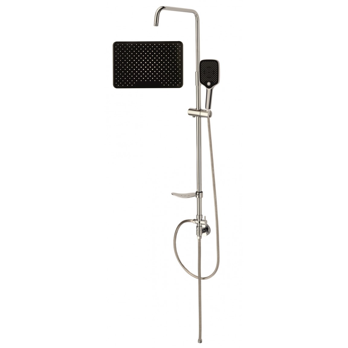 Modern kialakítású, állítható magasságú zuhanyrendszer nagyméretű felső esőztető fejjel, 3 funkciós kézizuhannyal, dupla SS304 gégecsővel és praktikus szappantartóval. Csaptelep nélkül, krómozott kivitelben, 2 év garanciával.